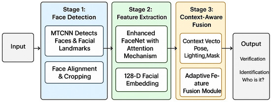 Face recognition begins with the input of a raw RGB face image, typically from a file or a camera (e.g., JPEG, PNG). The image is validated before preprocessing, where it is resized, normalized, and optionally enhanced to meet model requirements such as MTCNN and FaceNet. The MTCNN module detects and aligns faces by identifying key landmarks (such as eyes, nose, and mouth corners), enabling the system to crop and align the face accordingly. This preprocessing step minimizes variability in input data, enhancing recognition accuracy. After alignment, the latest FaceNet version extracts a 128-D embedding that captures the face’s unique features. The improved model utilizes an attention mechanism that focuses on unoccluded and informative parts, such as the eyes, particularly in cases of occlusion (e.g., masks). The embedding combines contextual information, such as head position or lighting, through an adaptive fusion layer that uses transformer-based attention to assign importance to features. The combined representation is compared with stored embeddings using similarity measures to identify or verify identities. Finally, low-confidence matches are filtered out during post-processing, and the resulting output is mapped and sent to the user or system interface as a label or verification result, completing the recognition process.