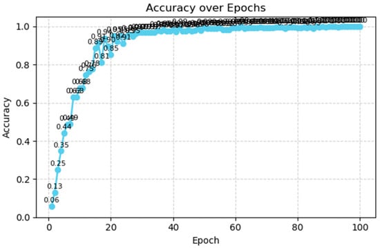 As demonstrated in Figure 4, the model’s accuracy improves as the epochs increase to 100, starting from a low 38% at epoch zero and gradually rising to 97% at epoch 100. The relatively linear growth reflects healthy learning dynamics, with no signs of plateauing or overfitting. The model reaches practical utility (>90% accuracy) by epoch 60 and continues to improve steadily, nearing optimal recognition ability (97%) at convergence. This indicates well-tuned hyperparameters and sufficient model capacity for the task, with accuracy steadily increasing without destabilizing oscillations.