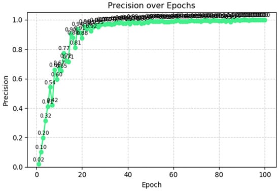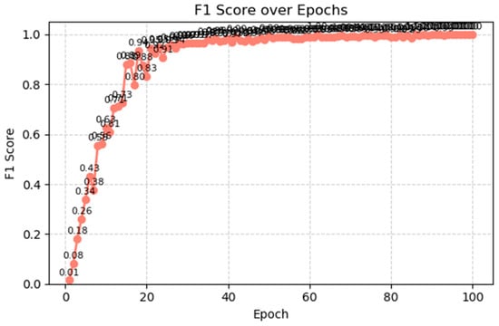 As shown in Figure 7, tracking the harmonic mean of precision and recall, the F1 score increases from 40% initially to 90% at epoch 100. Referring to Figure 5, the curve demonstrates rapid improvement between epochs 20–60 (rising from 60% to 85%), which is the model’s most critical period for learning discriminative features. Convergence to 90% F1—although slightly below the final accuracy—indicates a low precision-recall tradeoff, possibly caused by more false positives in edge cases. However, the steady rate of over 90% from epoch 80 onward reflects excellent generalization, and the balanced F1 metric ensures the model’s reliability for both positive and negative cases.