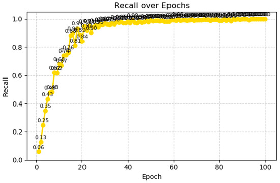 As depicted in Figure 6, the recall curve displays a similar pattern, starting at 0.06 in epoch 1 followed by a sharp increase. By epoch 10, the recall reaches 0.43 and then jumps to 0.84 by epoch 20, eventually leveling off near 1.0 after epoch 30. This rapid rise indicates the model’s quick improvement in distinguishing true positive cases. The leveling off near 1.0 suggests that the model learns to identify almost all relevant instances in later epochs. However, the move to near-perfect recall and accuracy raises concerns about overfitting, since both metrics plateau without further improvement. This implies the model might be becoming too tailored to the training data, which could harm its performance on new data.