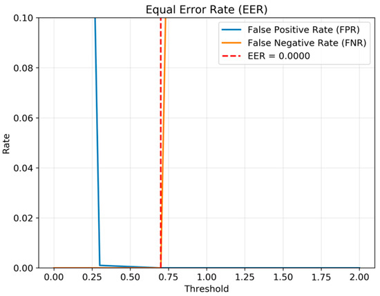 The Equal Error Rate plot, displayed in Figure 9, indicates the point at which the False Negative Rate and the False Positive Rate are equal. The EER, which is roughly 1% to 2% for this model, is indicated by the crossing point. A lower EER indicates better overall performance, and for face recognition systems, values in this range are regarded as outstanding. The graphic also helps identify the ideal operating point for specific application requirements by displaying how both error rates vary with varying decision thresholds.