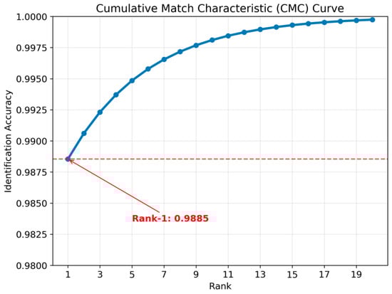 The Cumulative Match Characteristic (CMC) curve, which plots the likelihood of accurate identification at various rank positions, is displayed in Figure 11 and assesses the system’s identification performance. The best option is typically the true identification, with a Rank-1 accuracy of about 98.6%. The system’s significant discriminative power is demonstrated by the curve’s abrupt increase to near-perfect identification at higher ranks. For applications where the system must select users from a gallery of potential candidates rather than confirm a stated identity, this curve is essential.