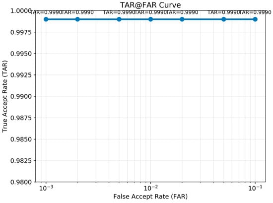 The True Acceptance Rate (TAR) and False Acceptance Rate (FAR) curve, which displays the model’s verification performance at different security levels, is displayed in Figure 12. The plot shows that the system maintains true acceptance rates above 98% even at extremely severe false acceptance rates (as low as 0.001). For high-security applications with very little tolerance for false acceptance, this indicates good performance. The system’s performance at the most security-critical operating points is highlighted by the logarithmic scale on the x-axis.