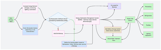 Energy loads for fish processing are based on Island Seafoods data and adjusted for Albatross Seafoods, while wastewater treatment is included in HY4RES. A wood drying kiln, powered by surplus wind energy, is modeled differently in each tool—constant in HY4RES and static in HOMER® 3.16.2 Pro. It identified two sites that are connected through a grid distributed point: a Primary site that initially includes combined hourly loads of Island and Albatross Seafoods using wind generation and five more scenarios with different combinations of biomass, PV, off-grid using BESS, and grid connection, as well as a Secondary site using hydropower and a grid connection in which two additional scenarios were analyzed, which were PV or an off-grid system using BESS.