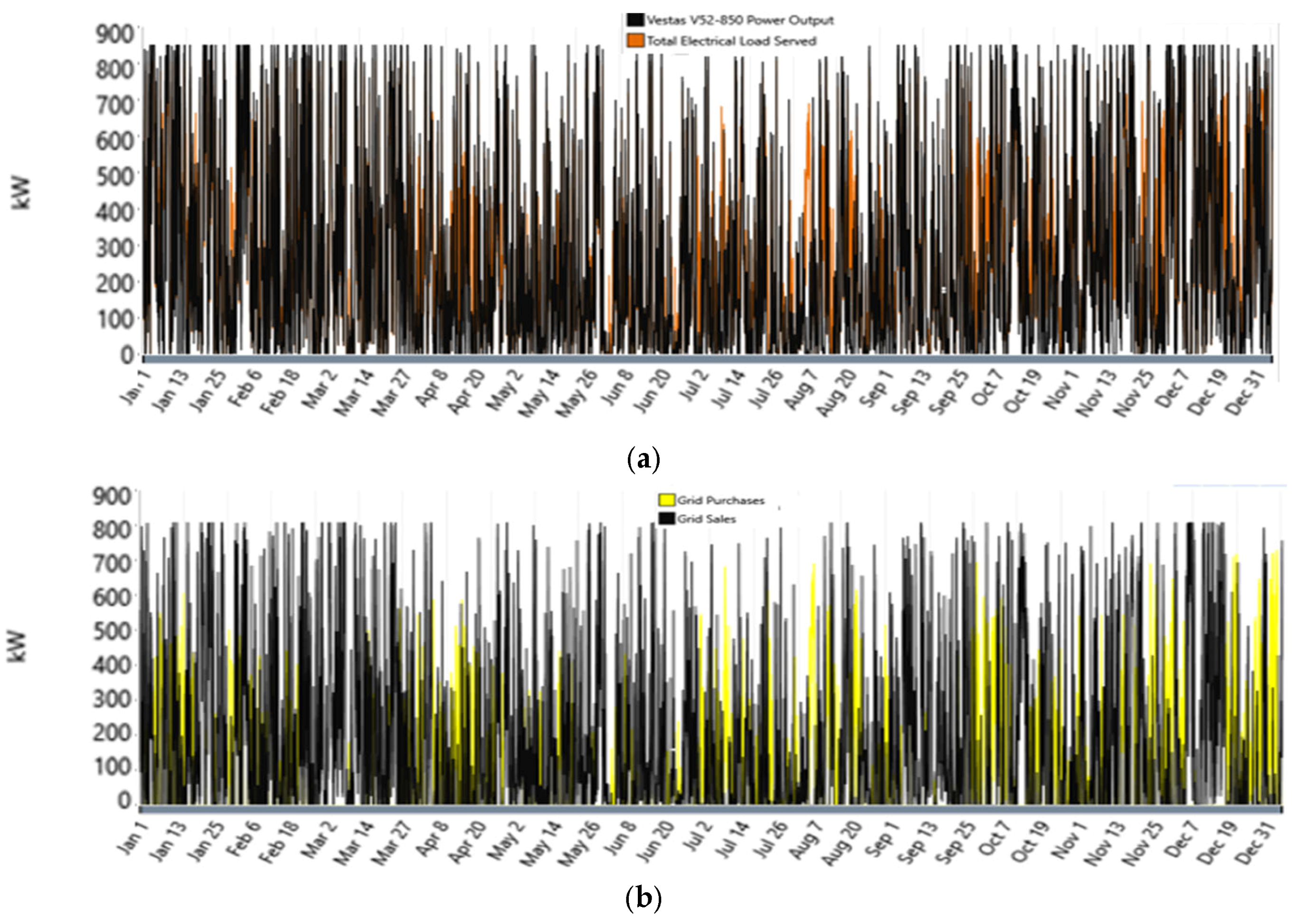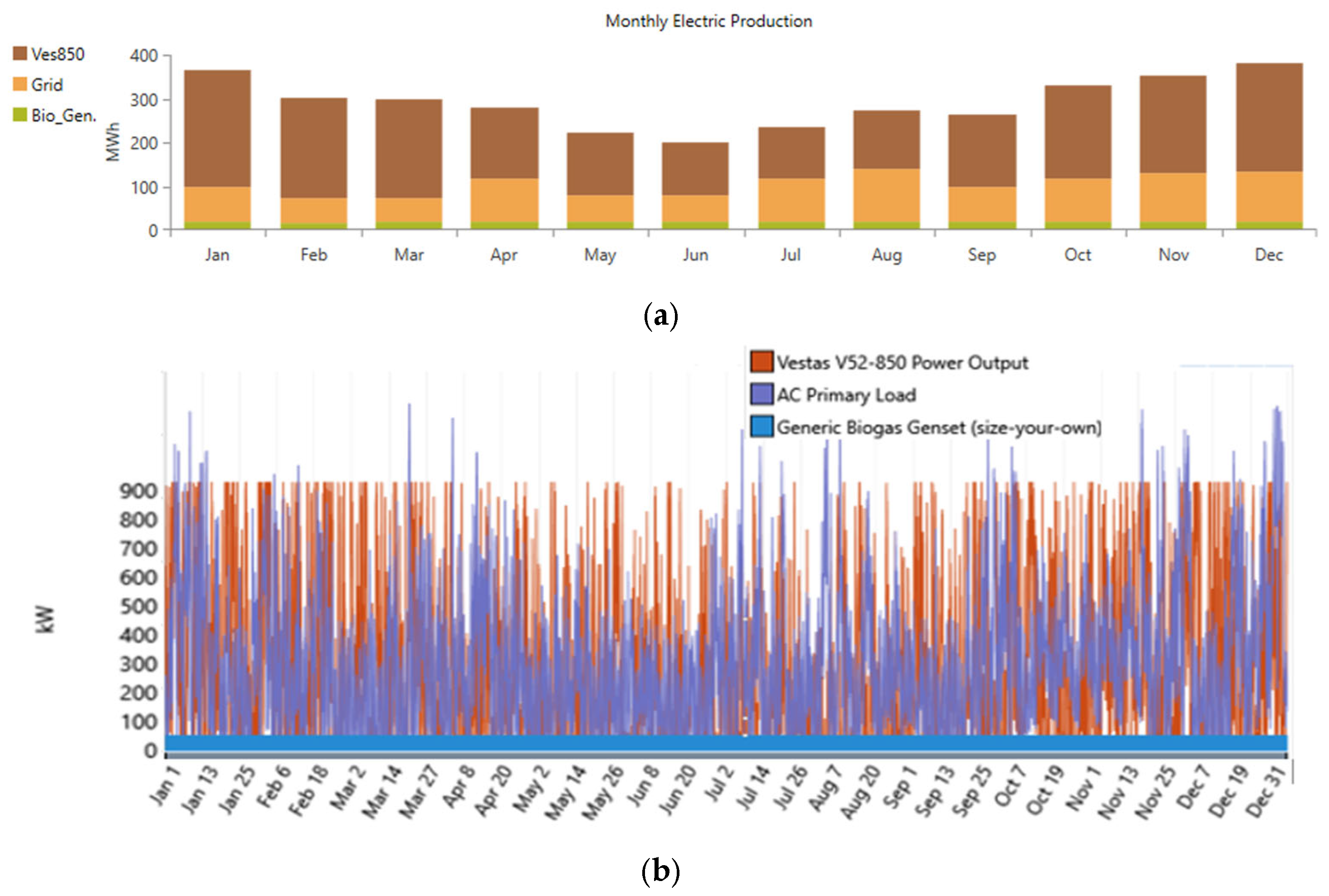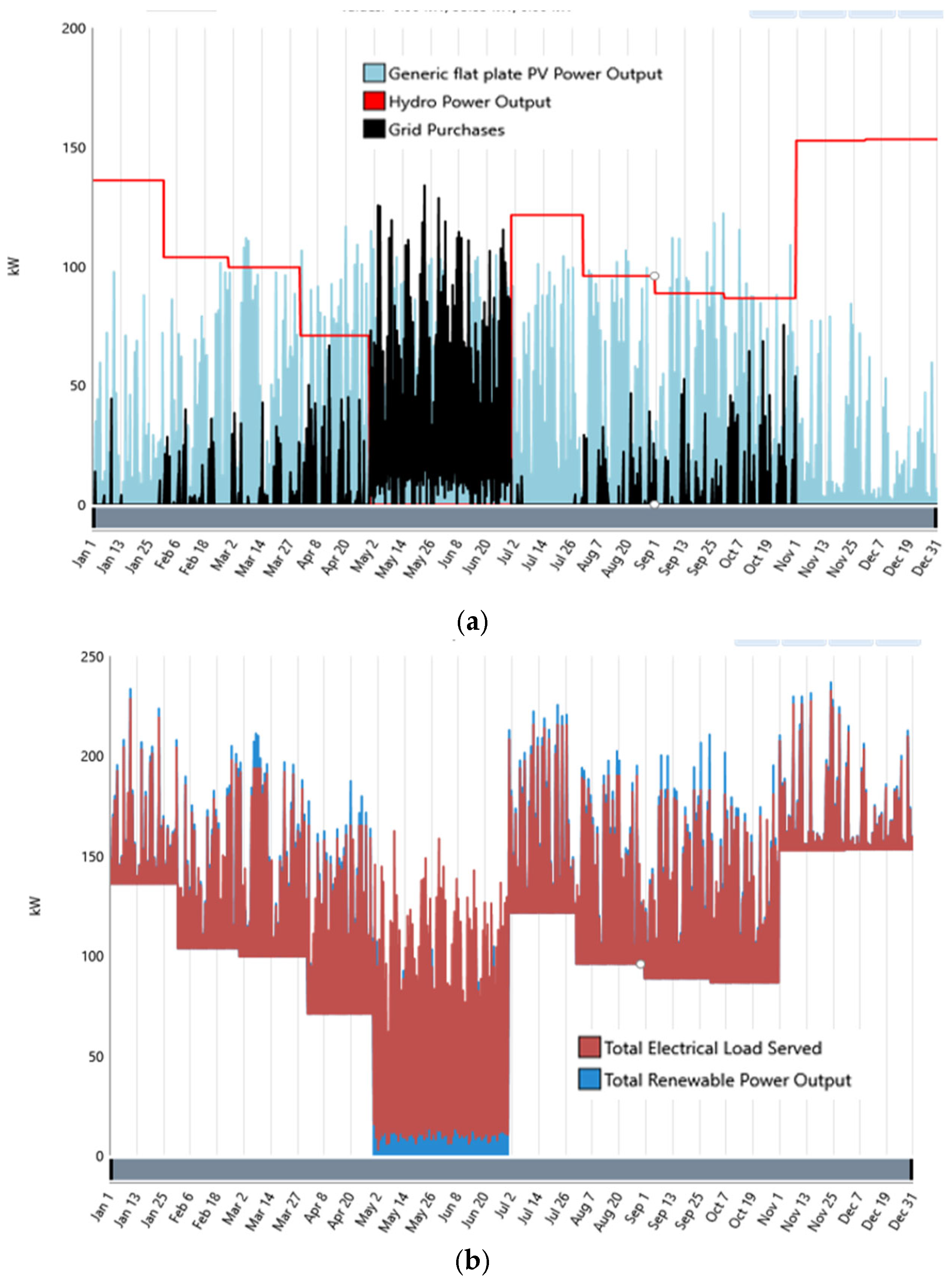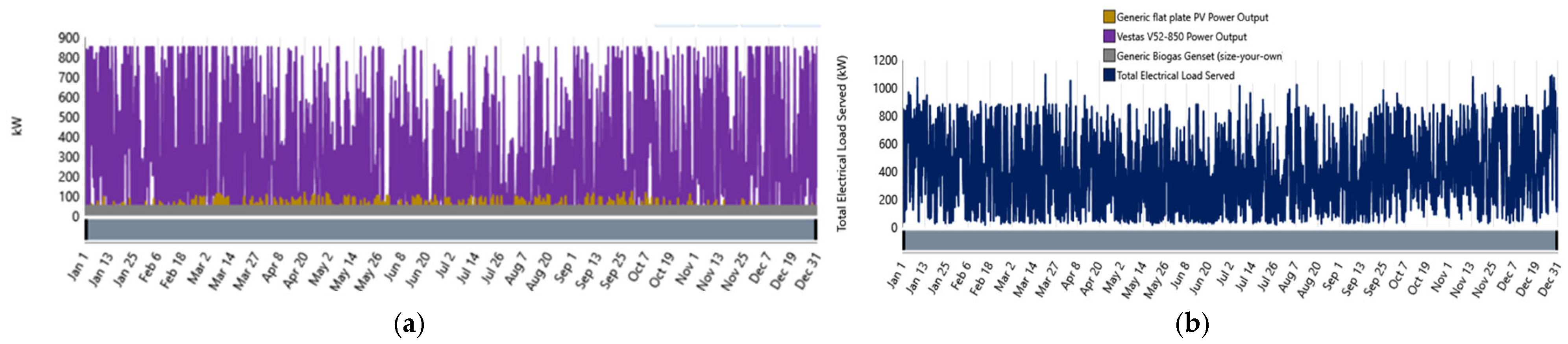 - Base Case (Secondary Site): It uses the hourly generation data from the small hydropower plant (SHP) as the tertiary generation input, and the hourly load profile of the wastewater treatment facility is entered as the site’s electrical consumption.