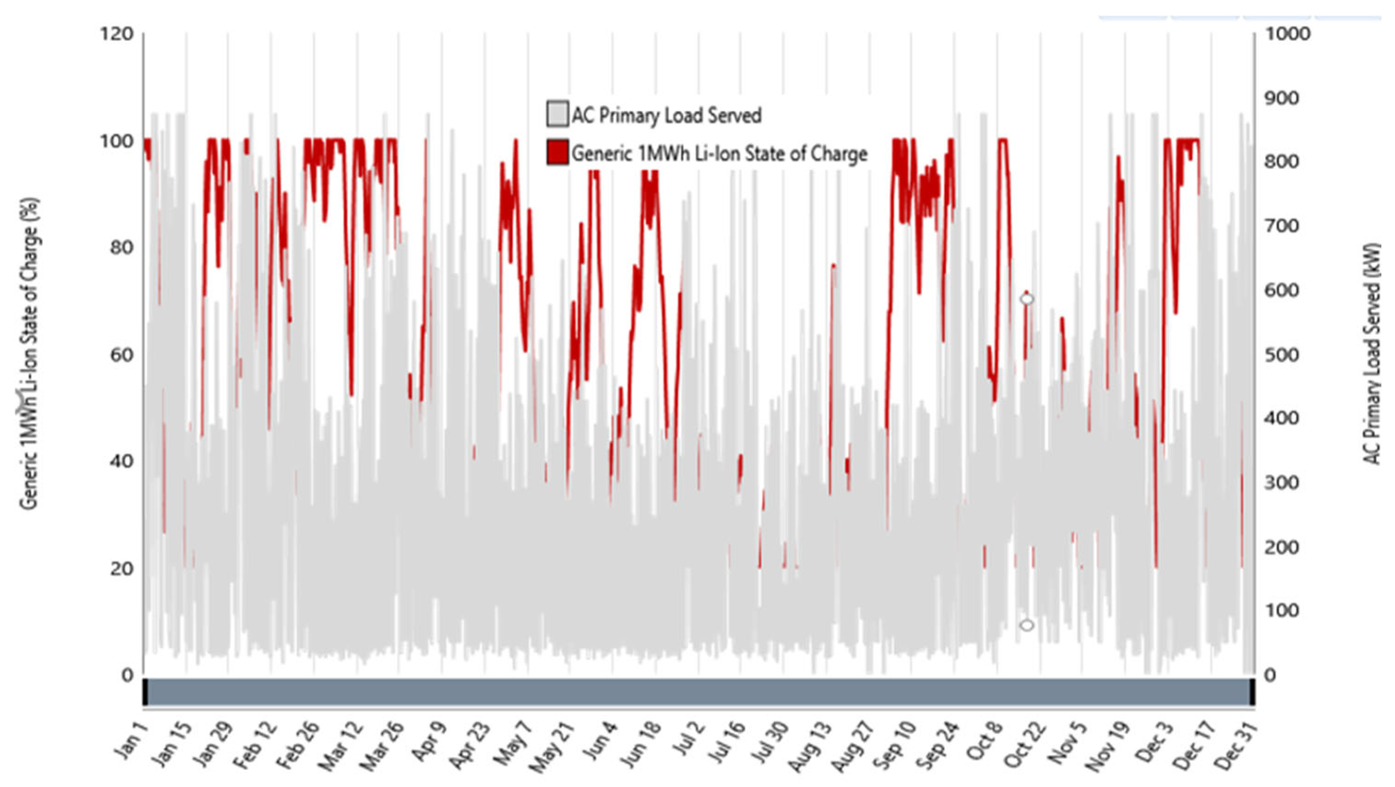 - Scenario 3 (Off-grid): Uses only wind, biomass, and a 22 MWh BESS. Load reductions are based on unmet demand; less wood is dried.