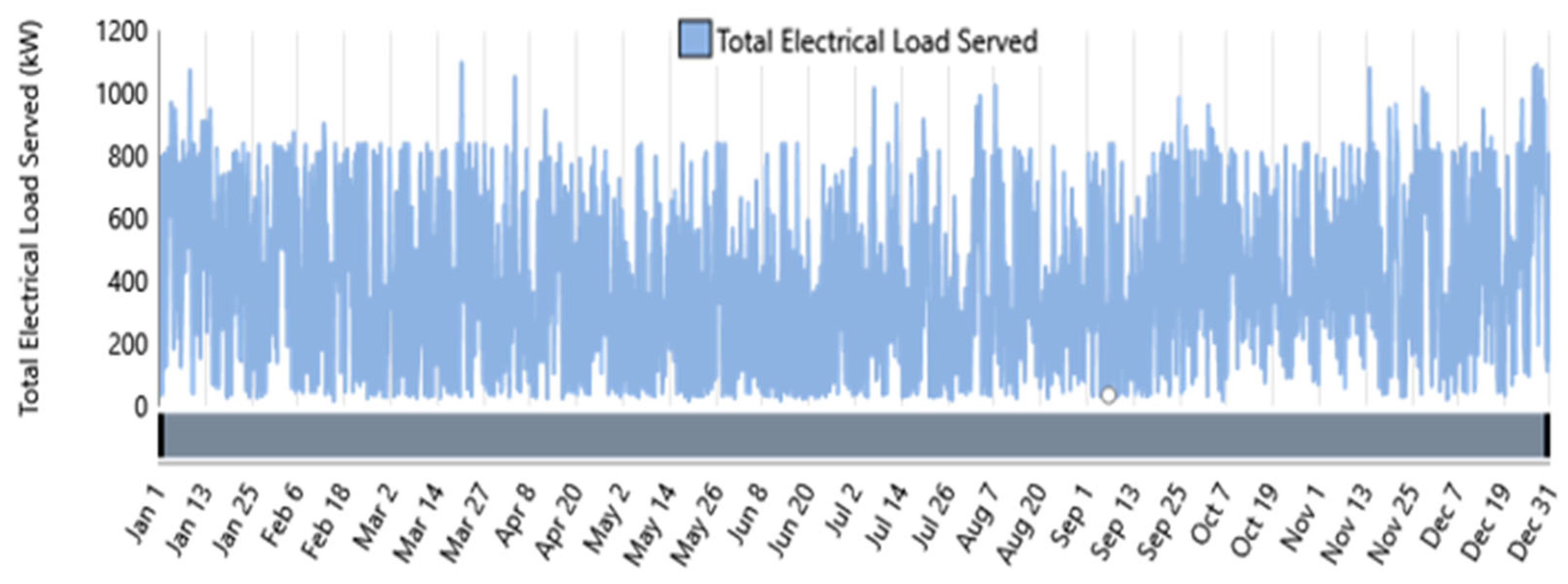 - Wastewater treatment plantThe same approach as for the fish processing facilities was repeated for the data from the wastewater treatment plant. For certain timestamps, data was missing, or too many timestamps were recorded. In this case, the surplus timestamp data was added to another timestamp where the load was zero, to reach the correct yearly total. In HOMER Pro, a different approach is chosen. A commercial electricity consumption profile from the library with 1200 kWh/day and 430.72 kW peak is used.