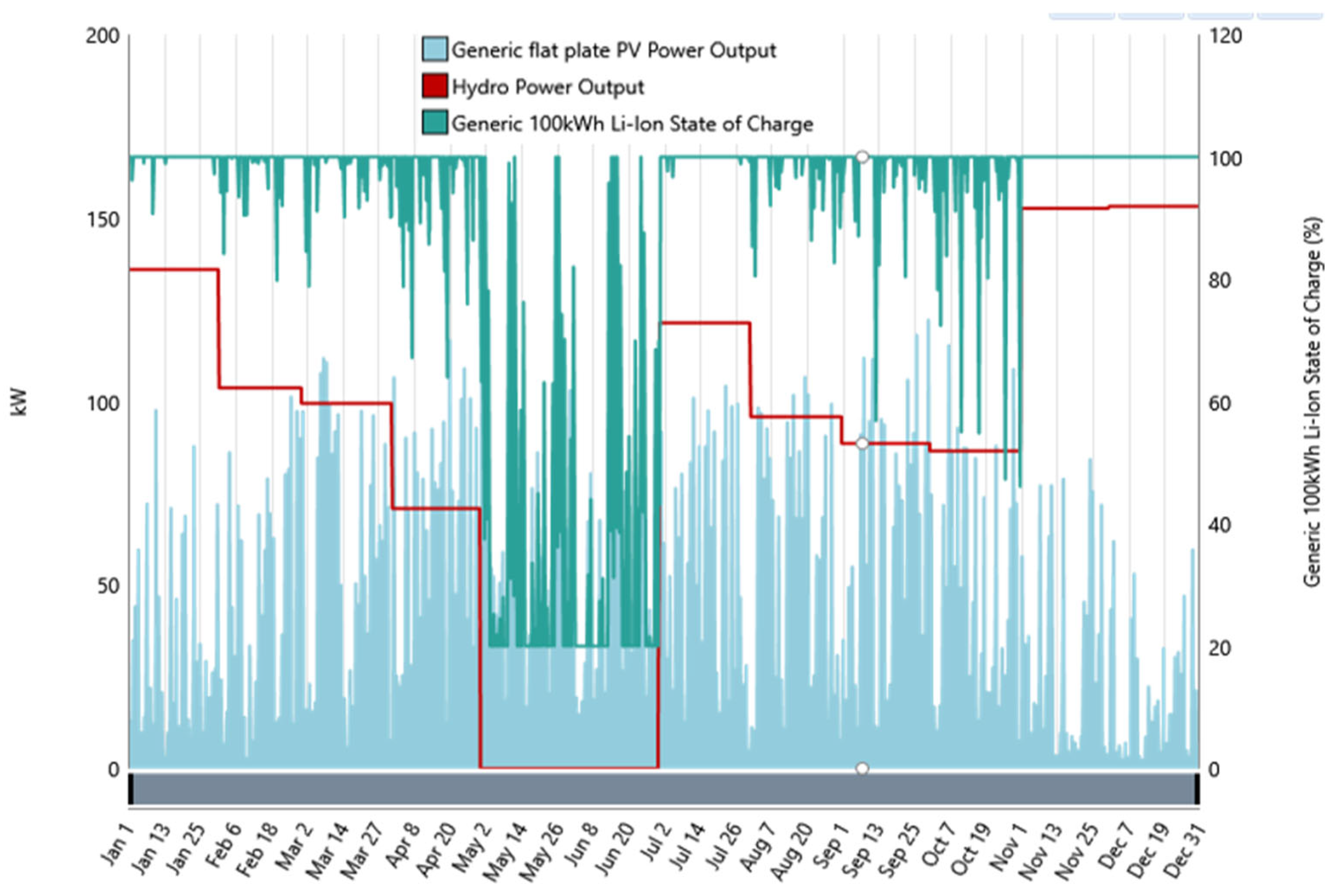 - Scenario 2 (Off-grid): Replaces the grid connection with a 400 kWh BESS. The system does not fully meet demand in summer due to low hydro generation.