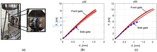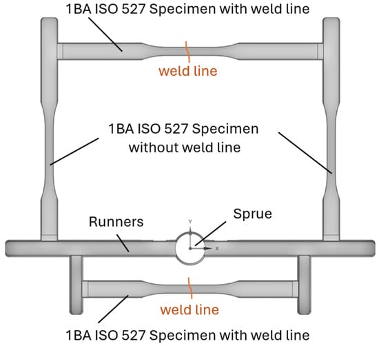 The influence of the weld line on the strength characteristics of the material was assessed using the specimens as an example (Figure 1). The tensile curves of each material are shown in Figure 2. Mechanical tests of the molded specimens were conducted using a universal servo-hydraulic machine (MTS 322) until the structure failed. For each of the considered materials, 1BA type specimens with and without a weld line were produced by injection molding according to ISO 527-2 [] (Figure 3).