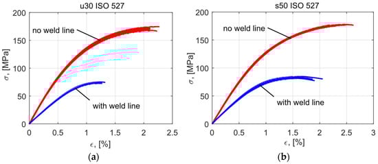 Stress–strain curves for 1BA ISO-527 [] specimens with and without a weld line: (a) carbon-filled plastic and (b) glass-filled plastic.
