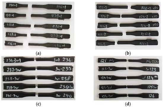 Injection-molded 1BA ISO 527-2 [] specimens with and without a weld line after testing: (a) u30 without weld line, (b) s50 without weld line, (c) u30 with weld line, and (d) s50 with weld line.