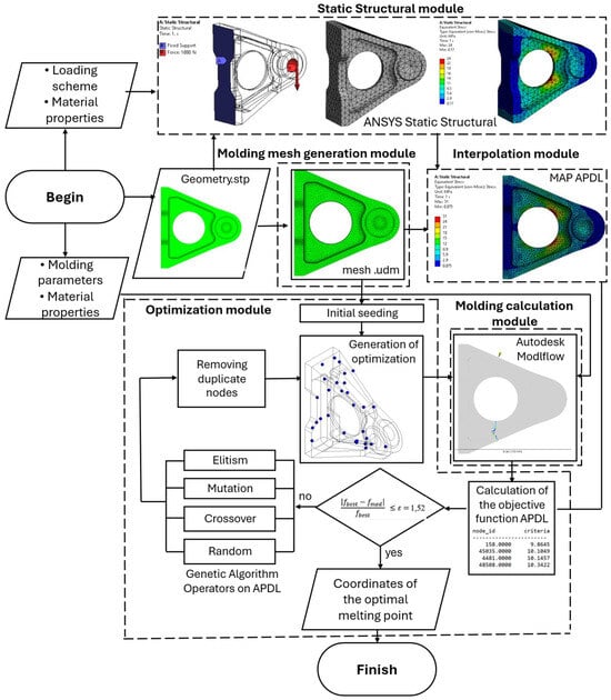 The algorithm for optimizing the melt injection point [] is implemented as a modular code structure (Figure 4).