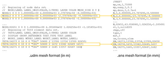 Further processing of operations on the finite element mesh is performed using the ANSYS kernel through calls in the APDL language. The mesh in the .udm format is first converted to the format .ans (Figure 6). Computational meshing was performed using C programming language.