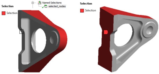 The mold design assumes the possibility of bringing the melt injection point to certain surfaces of the part under study. The possible runner geometry and gate location depend on the complexity of the mold shape and technological features of the injection molding process, including limitations on gate diameter, issues of mold deformation, and organization of part ejection. In cold runner gating systems, the melt entry points are often on the part’s side surfaces, which facilitates mold opening. Code implementation of accounting for process constraints is carried out in the \manufc module of the GateOptWeld3D code [,] (\manufc\master.txt, \manufc\write_ext_nodes.txt) by selecting surface geometry elements located on the Named Selection with the name “sel_nodes” of the static_structural.db project using the function. The Named Selection can be assigned to the ANSYS workbench mechanical interface (Figure 7) during the strength calculation stage.