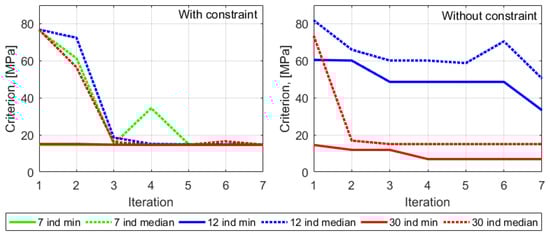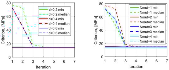 Optimization methods are also well suited for solving the problem of constructing an optimal molding process considering the weld line location []. The most popular methods are the Tauguchi method [], finite element methods [], genetic algorithms [,], and machine learning methods [,]. The choice of the optimization criterion that considers the molding process’s specifics affects the solution’s convergence []. Equivalent stresses are often used to determine the strength of weld-line-containing structures []. Therefore, the maximum equivalent stress is the main parameter for selecting the objective function. In [], the half-sum of the average and maximum equivalent stresses on the weld line is also considered an optimization criterion. This study compares the most frequently used optimization criteria and assesses the convergence of the genetic algorithm for each of them. The molding optimization problem requires a multidisciplinary approach that considers molding hydrodynamics and solves the strength problem to improve the quality of mold products and minimize the weld line’s negative impact on strength.