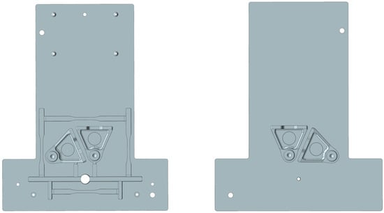A mold that includes two bracket molding options has been designed for molding a three-dimensional spatially loaded structure with different melt entry points. The first option is the case of the weld line coinciding with the most loaded place, and the second is the optimal option for the gate location, with the lowest stresses on the weld line. Tensile molding of specimens according to the ISO 527 standard [] was also performed, including and not including the weld line. Figure 15 shows the three-dimensional geometry of the mold in the NX.
