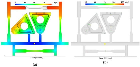 Verification calculation of polyamide molding in a designed mold: (a) molding front and (b) welding lines.