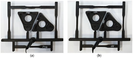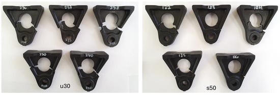 More than 20 brackets were made of carbon-filled polyamide Gamma-plast UPA 6 30 M and more than 20 brackets were made of glass-filled polyamide Poliplastic Armamid PA6 SV 50-1. The mold temperature was 80 °C (in the regular zone) and 100 °C (near the sprue bushing). The melt temperature was 250 °C for glass-filled polyamide and 230 °C for carbon-filled polyamide. The volumetric flow rate of the mold filling was 28 cm3/s, and the mold filling time was 3.5 s. Figure 18 show the brackets made of different materials and manufactured on an injection molding machine.