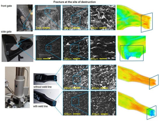 Using a Tescan Vega electron microscope, a comparison was made between the orientation of the fibers at the fracture sites of bracket samples manufactured with different gate locations, as well as a comparison of the orientation of the fibers at the fracture sites of the witness samples (Figure 21). Tests showed that fracture of brackets molded from the side entrance of the melt occurred along the weld line. The side-molded bracket fracture was located along the weld line, and the fibers lay predominantly in the fracture plane. It is one of the reasons for the reduced strength of the brackets with weld line problems. The front-molded bracket did not contain a weld line at the fracture site and the fibers in fracture place were predominantly perpendicular to the fracture plane (along the molding). A similar pattern was observed in witness specimens molded with and without a weld line: in the case of weld line specimens, the fibers were in the plane of the mold front closure, while in the specimens without a weld line, they were aligned with the molding direction. Electron microscopic examination of the fracture surfaces of the brackets and test specimens revealed no delamination of the material. This is due to the short reinforcement of the material and the presence of fibers in various directions. Moldflow calculations of the fiber orientation tensor were consistent with electron microscope data, which validates the modeling methodology.