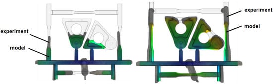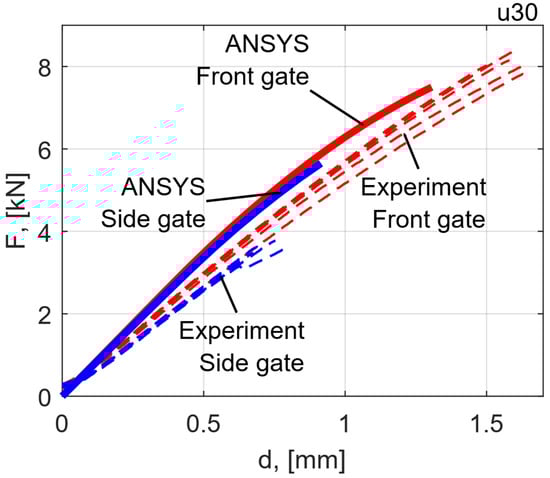 According to the results of the mechanical tests, the failure of the brackets in which the sprue was on the side occurred along the weld line. The fibers lay along the fracture line in this case. The failure site did not contain a weld line in the second case of bracket molding, and the fibers were mainly located along the molding direction. The same picture was observed when the failure sites of the witness specimens were studied. A comparison of the experimental results and the results of calculating the stress–strain state of brackets with different gating system locations in the ANSYS was also performed (Figure 23).