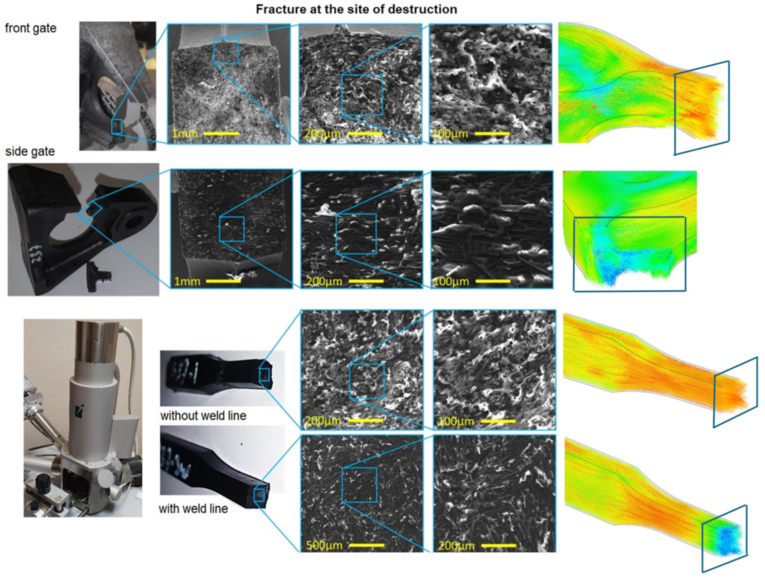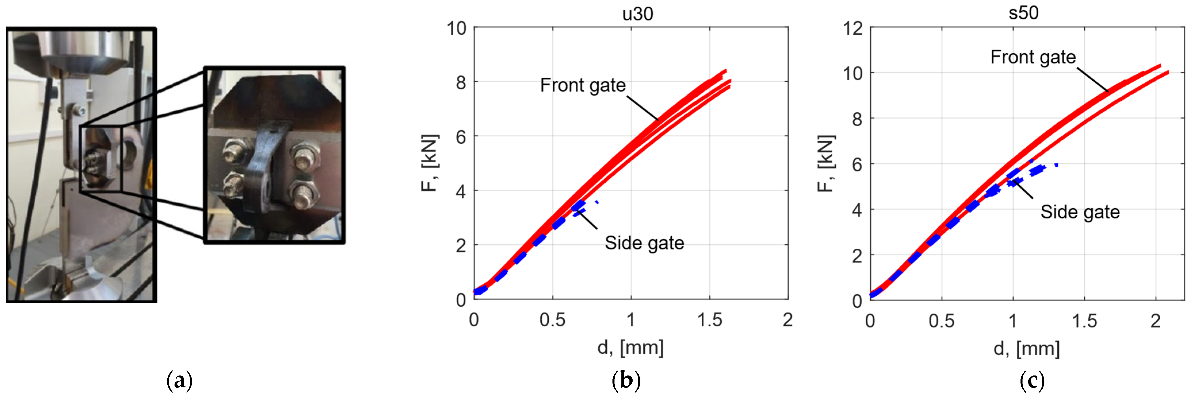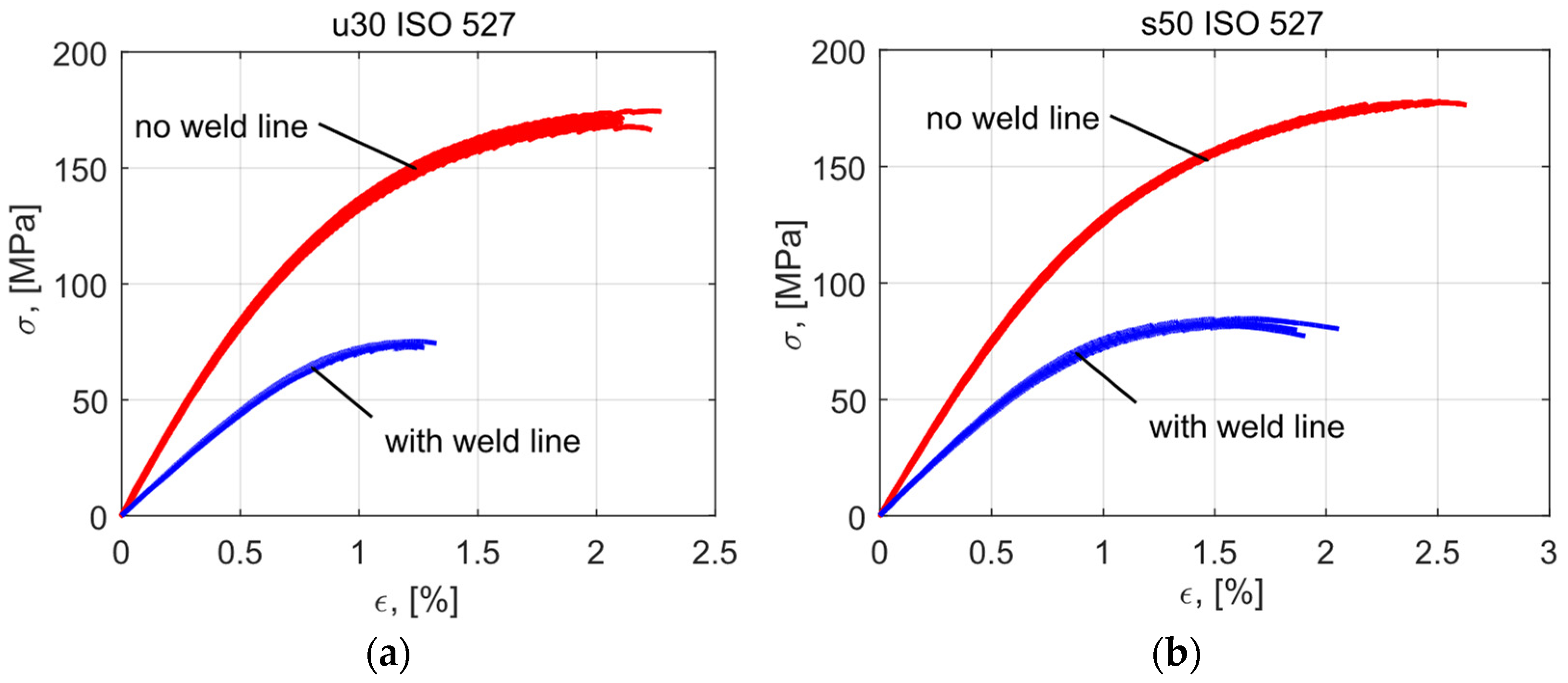 - Quintana, C.; Frontini, P. Weld line strength factors in a reinforced injection molded part: Relationship with predicted fiber orientation. J. Reinf. Plast. Compos. 2019, 39, 219–230. [Google Scholar] [CrossRef]