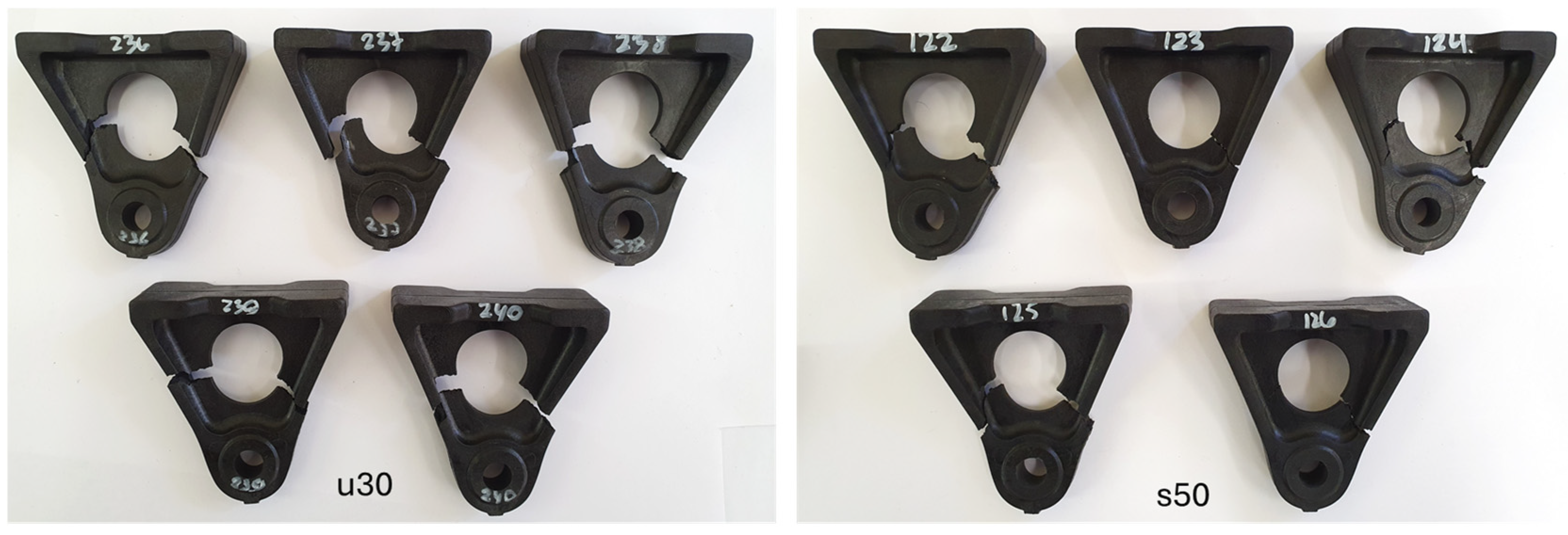- Kurkin, E.I.; Spirina, M.O.; Zakhvatkin, Y.V.; Chertykovtseva, V.O. The influence of the weld line location on the mechanical characteristics of lugs from short fibers reinforced composite material. In Proceedings of the 18th International Conference “Aviation and Cosmonautics” (AviaSpace-2019), Moscow, Russia, 18–22 November 2019. [Google Scholar] [CrossRef]