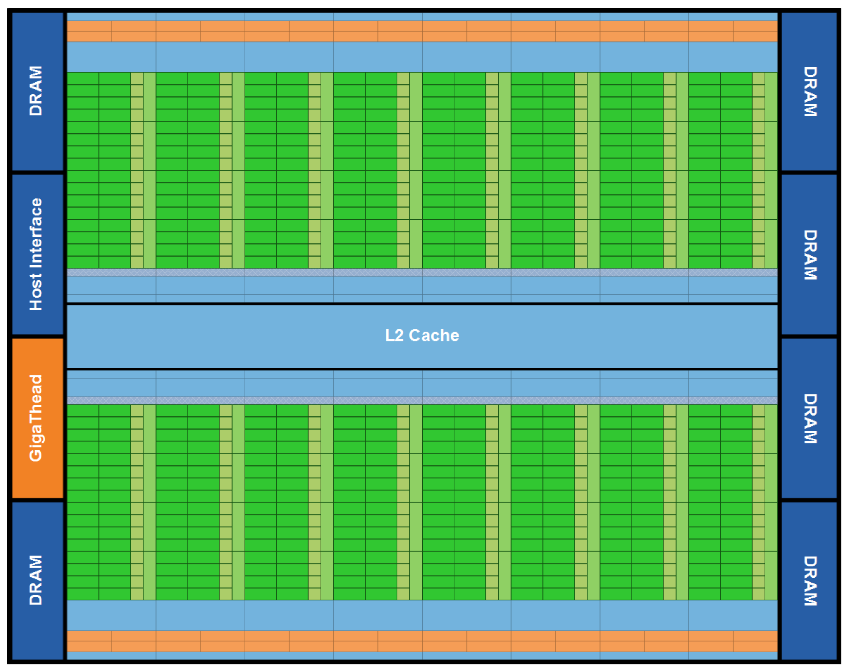 - L2 cache/shared memory is located between the SMs and the external physical memory. The shared memory is used to store shared data between all SMs.