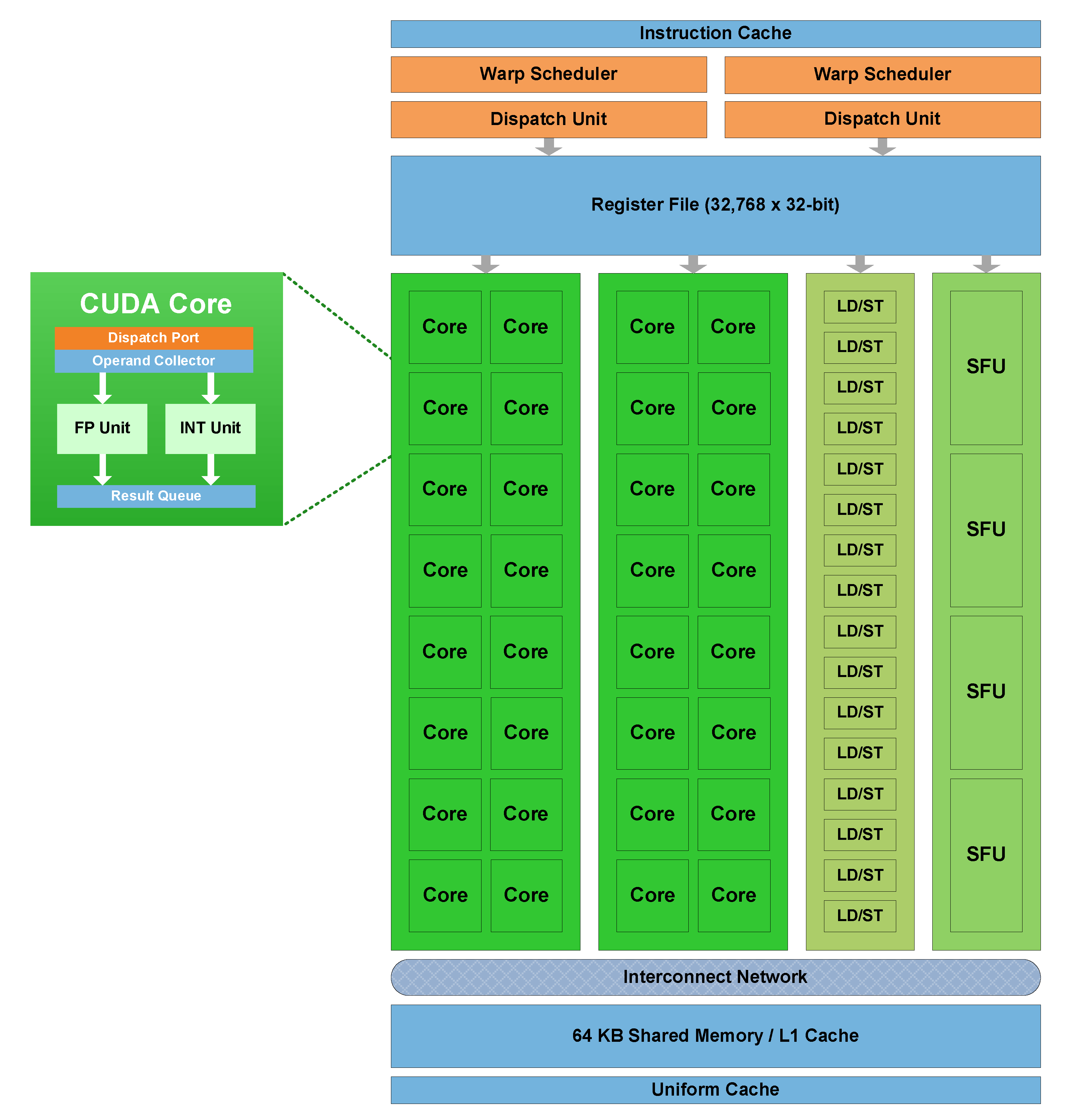 - Multiple processing cores that are organized into one or more “streaming multiprocessor” (SM) units as illustrated in Figure 2. Each SM unit is responsible for executing a set of instructions in parallel such that all processing cores at any given time execute the same instruction of different data elements. SM also consists of a large register file, an instruction cache, a data cache/scratchpad memory, a dispatch unit, and a thread scheduler.
