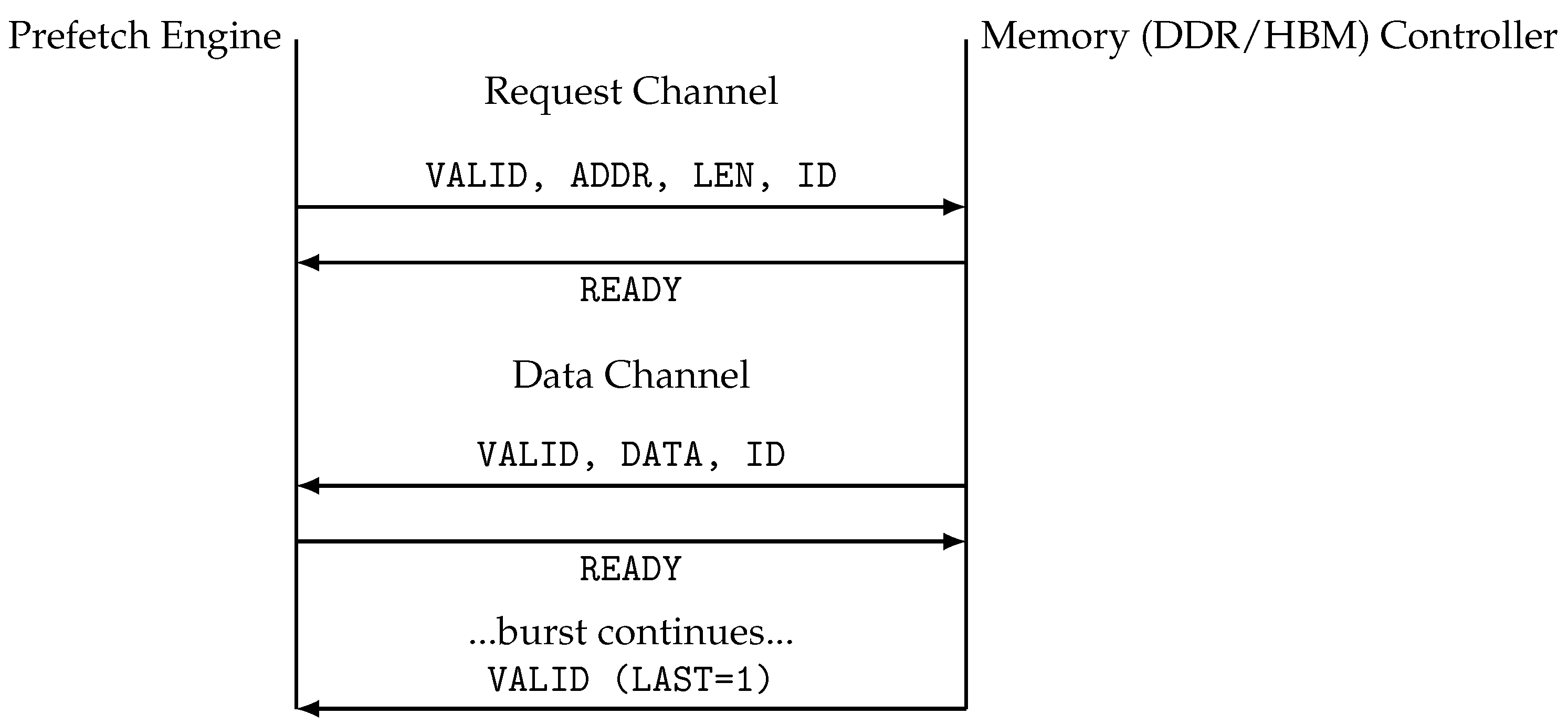 - Prefetching Engine: The prefetcher is the core component under evaluation. It interacts with two sets of AXI ports.