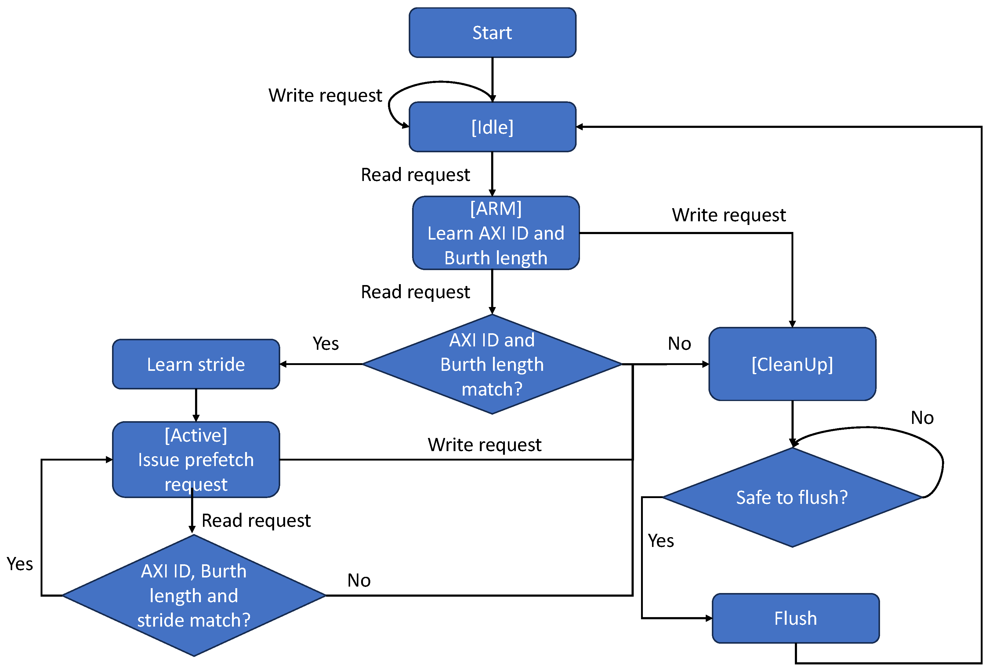 - IDLE. An initial state. Upon the first read request, that falls into the prefetch engine address range, the predictor stores the AXI ID and AXI burst length, and transitions to the ARM state.