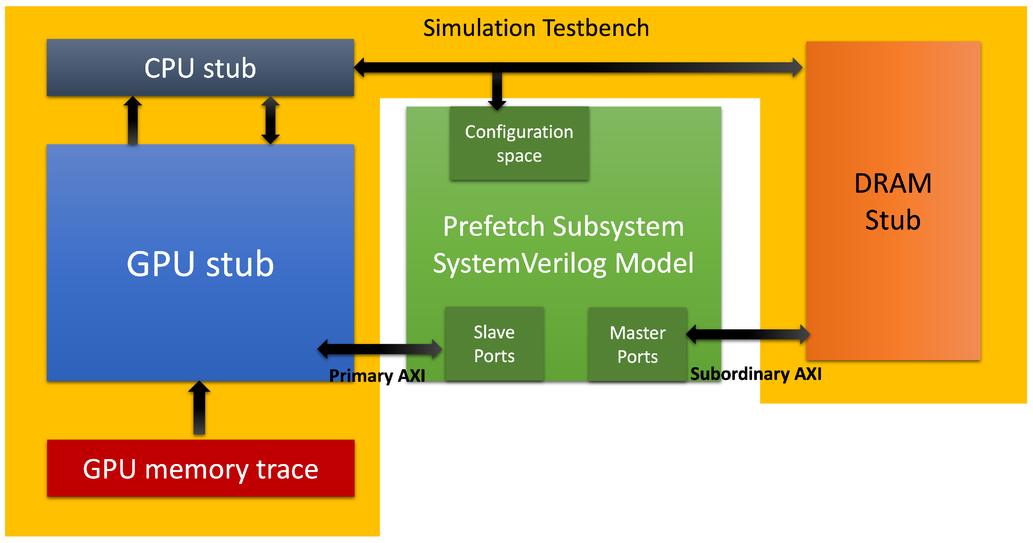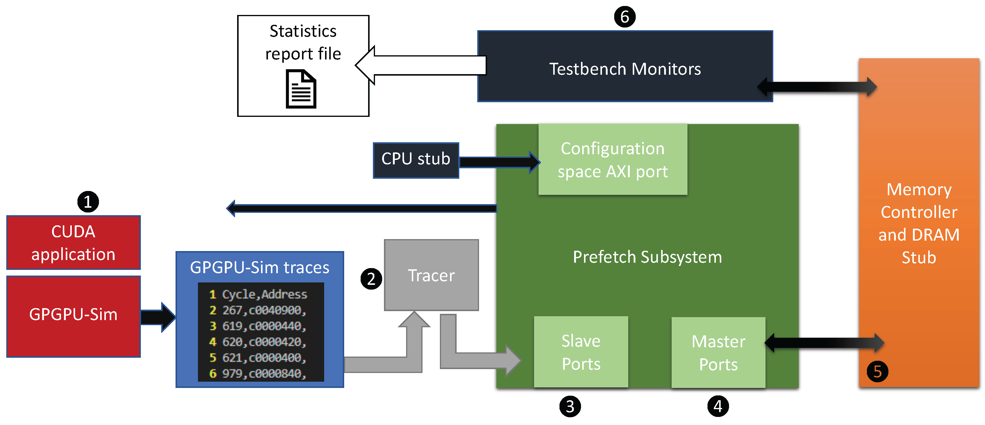Additionally, the Configuration Space AXI Port is managed by the CPU stub, which orchestrates the simulation and configures the prefetcher. - Memory Controller and DRAM Stub ❺: The Memory Controller and DRAM stub emulate DRAM memory behavior, including latency modeling for open and closed page accesses. This stub responds to read and write requests generated by the prefetcher and Tracer modules.
