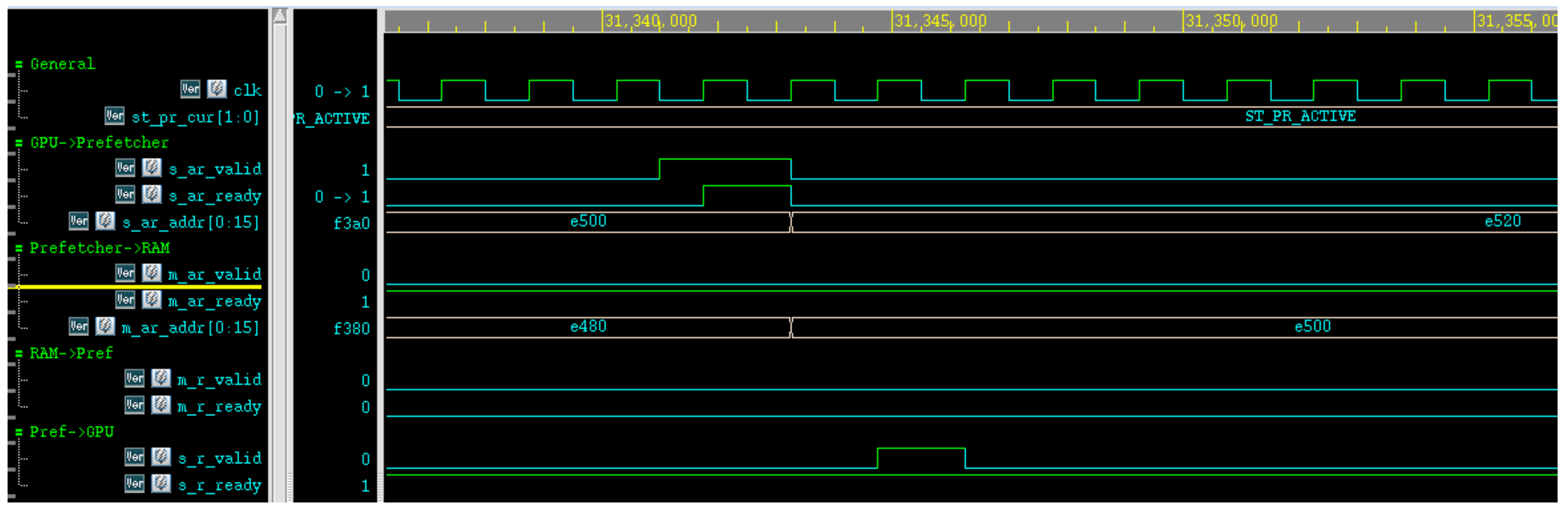 - Valid read request from the AXI initiator. When a new transaction is initiated on the primary AXI bus, the handler acknowledges the initiator’s request and assigns a new request to the data path. In the case of a read request falling into the prefetch window that has not been prefetched yet, it issues a new read request to the subordinate AXI bus.