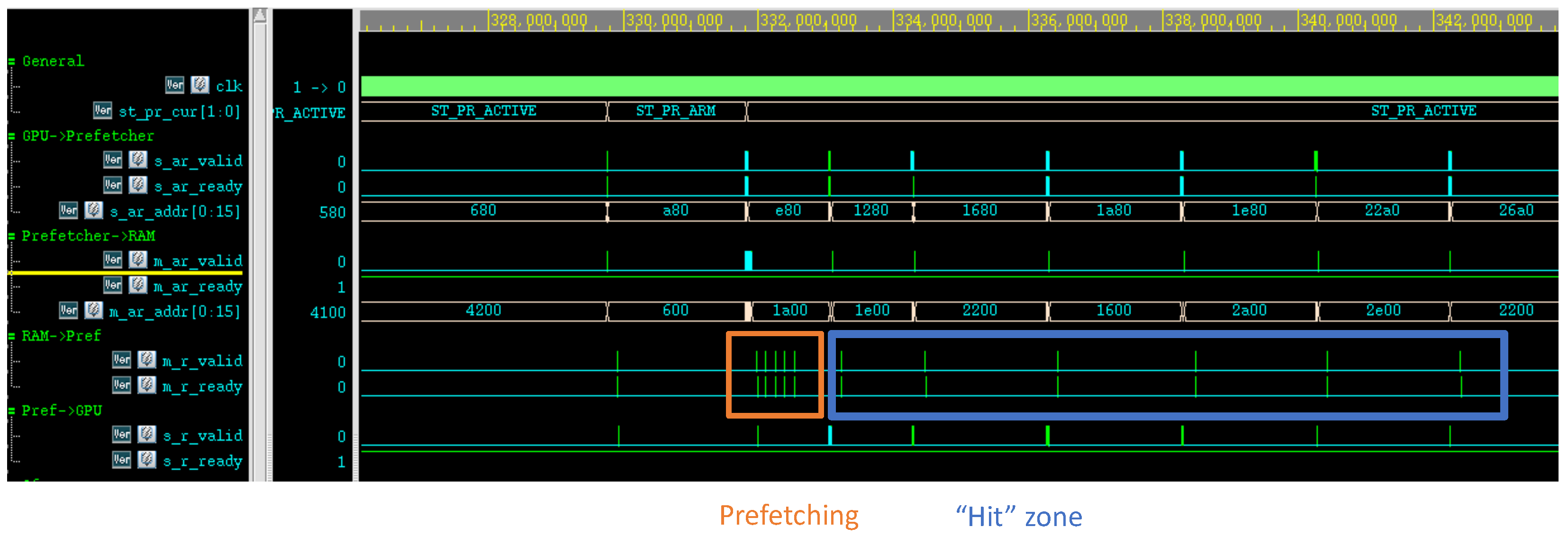 - The GPGPU issues a read request on address: 0x1008, burst length: 3, AXI ID: 10. Since the data has already been prefetched, the data is forwarded immediately to the GPGPU.