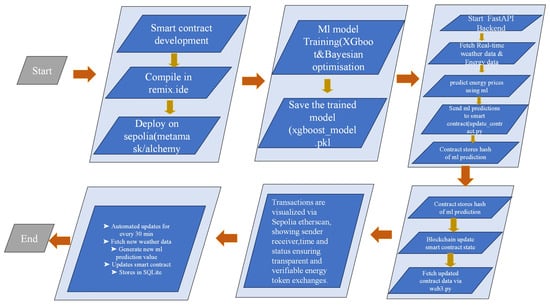 As illustrated in Figure 1, the system process begins with the deployment and creation of smart contracts in the Ethereum Sepolia test network using a machine learning model. The machine learning model was initially trained with XGBoost and then improved using Bayesian optimization methods. Subsequently, the backend—implemented with FastAPI—is configured to collect real-time weather data and generate energy price predictions using the trained model. The provided values are then sent to an intellectual delivery agreement on the blockchain, and the complete system operates at a coherent interval of 30 min, ensuring a constant freshness of the data and a specific pricing mechanism.