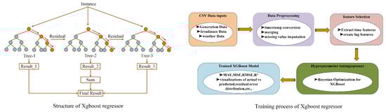Figure 2 illustrates the comprehensive structure and training process of the XGBoost regressor implemented in the energy prediction system. The left side demonstrates the ensemble architecture of XGBoost, showing how multiple decision trees (Tree-1, Tree-2, Tree-3) are combined through weighted summation to generate the final prediction result. Each individual tree operates on different data subsets and produces residual corrections that address errors from previous trees, enabling the ensemble to capture complex nonlinear patterns and interactions in energy generation data. The right side depicts the complete training pipeline, initiated with CSV data inputs containing historical energy generation data, solar irradiation measurements, and meteorological variables, followed by comprehensive preprocessing steps including timestamp standardization, multi-source data integration, and statistical imputation of missing values. The workflow continues with feature engineering to extract temporal patterns and create lagged variables, followed by hyperparameter optimization using Bayesian methods specifically configured for XGBoost parameters. The trained model generates comprehensive evaluation metrics including MAE, MSE, RMSE, and , complemented by diagnostic visualizations comparing actual versus predicted values and residual error analysis, ensuring thorough validation of model performance and reliability for energy forecasting applications.