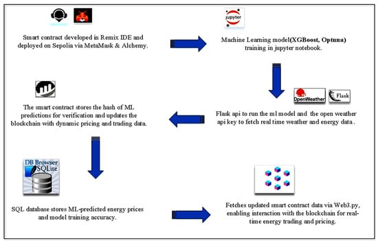 Figure 3 provides an overall account of the blockchain-based peer-to-peer energy trading process and illustrates the relationship among different components of the system. It indicates how the smart contract developed in Remix has been deployed onto Sepolia via MetaMask and Alchemy and communicates with the machine learning model developed using XGBoost and Optuna optimization on Jupyter notebooks. The API acts as a central coordination layer that utilizes the ML model and the OpenWeather API key to retrieve weather data for real-time energy estimates. Smart contracts store ML predictions as hash for verification and upload blockchain with dynamic pricing and trading data. The system supports SQLite databases for storing ML energy price predictions and model precision, while Web3.py supports ease of connectivity with the blockchain for trading energy and real-time operations.