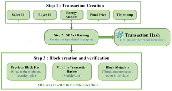 Figure 4 illustrates the comprehensive workflow of processing blockchain transactions for the energy trading system. The process begins with Step 1: Transaction Creation, whereby key elements of the transactions are gathered, such as Seller ID, Buyer ID, Energy Amount, Final Price, and Timestamp. The transaction attributes are then put through cryptographic hashing in Step 2: SHA-3 Hashing, such that a unique digital fingerprint that serves as a tamper-proof identifier for each energy trading transaction is created. The orientation of numerous transaction hashes using Merkle Root structures, along with the Previous Block Hash to maintain blockchain continuity and security links, and encapsulated with Block Metadata that includes timestamp, nonce, and other crucial block information, is presented in Step 3: Block Creation and Verification. This organized approach ensures the linkage among all the blocks, resulting in an immutable blockchain enabling transparent, verifiable, and secure energy token transactions.