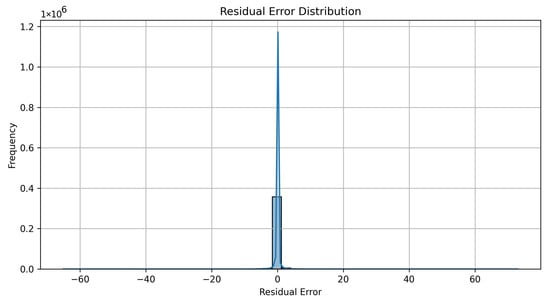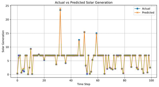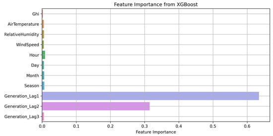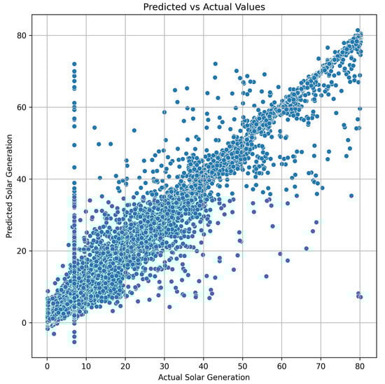 The coefficient of determination () quantifies the proportion of energy generation variance explained by the XGBoost model, as formulated in Equation (9). The numerator  represents the Residual Sum of Squares (RSS), quantifying the total squared deviations between actual energy measurements and model predictions, essentially measuring the variance left unexplained by the model. The denominator  represents the Total Sum of Squares (TSS), where  is the arithmetic mean of actual energy generation values across all test samples, quantifying the total variance in the target variable that would exist if using only the mean as a predictor. The  coefficient ranges from 0 to 1, where values approaching 1 indicate superior model performance with the model explaining most of the variance in energy generation, while values near 0 suggest poor performance equivalent to simply predicting the mean value for all observations. An  (97.45%) indicates that the XGBoost model successfully explains over 97% of the variance in solar energy generation, leaving less than 3% unexplained.