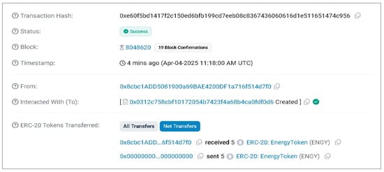 The system has been implemented on the Ethereum Sepolia testnet, selected due to its compatibility with the functionalities of the Ethereum mainnet while providing a cost-effective and low-risk environment for the purposes of development and testing. The network is supported by Ethereum’s Proof-of-Stake consensus mechanism, which enhances energy efficiency and fosters environmental sustainability. The choice of this particular network was informed by multiple criteria. Among these is its transaction capacity, which stands at approximately 15 transactions per second, deemed adequate for the frequency and volume of energy trading activities. Furthermore, Sepolia’s Gas Commission is characterized by predictability and economic feasibility, allowing for accurate economic modeling of transaction expenses. Additionally, the Ethereum Ecosystem offers a well-established suite of tools for community development, documentation, and support, which facilitates optimized integration and deployment. Moreover, the platform exhibits a strong history of security, with resistance mechanisms that mitigate various common types of network attacks.