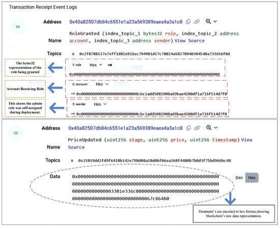 Event Log #35 records a PriceUpdated event that monitors alterations in energy pricing data. This event comprises three parameters (stage, price, and timestamp), with all data encoded in a hexadecimal format, as shown in the raw data section. This thorough documentation of price modifications ensures pricing transparency for all network members.