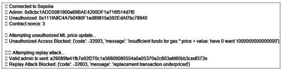The contract canceled the transaction when a regular wallet tried to change the ML price without enough money or permission, showing that prices were protected and access was controlled. The contract additionally establishes a mechanism to prevent replay attacks utilizing nonces. Each significant transaction possesses a unique nonce; any nonces that are utilized multiple times are promptly disregarded. Figure 15 illustrates the requisite nonce for executing and transmitting a legitimate transaction from the administrator. The contract rejected the replayed transaction data due to error code -32603, which involved the same nonce. This case demonstrates that the contract ensures each transaction is distinct and the timestamp is accurate, hence enhancing its resistance against spoofing and replay attacks.