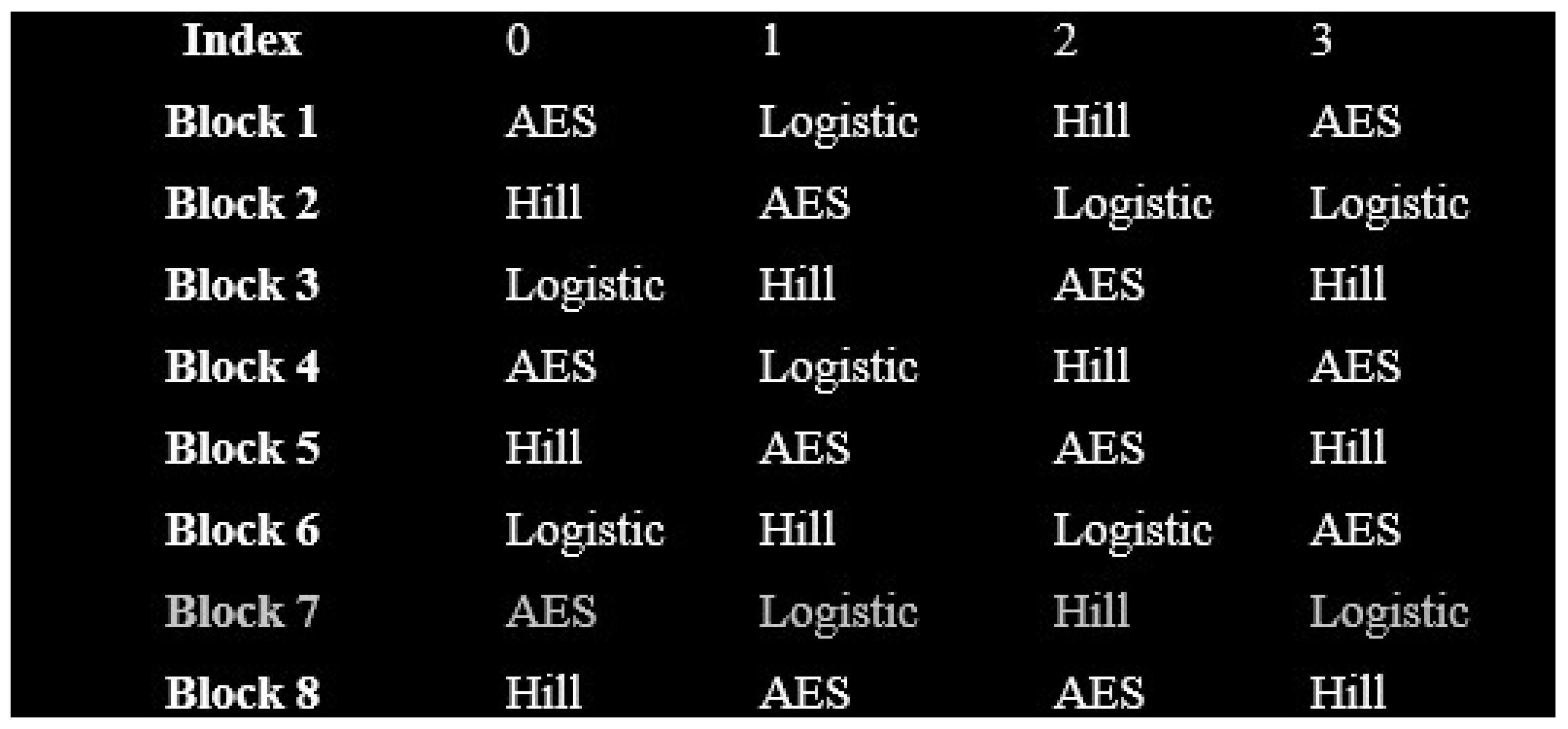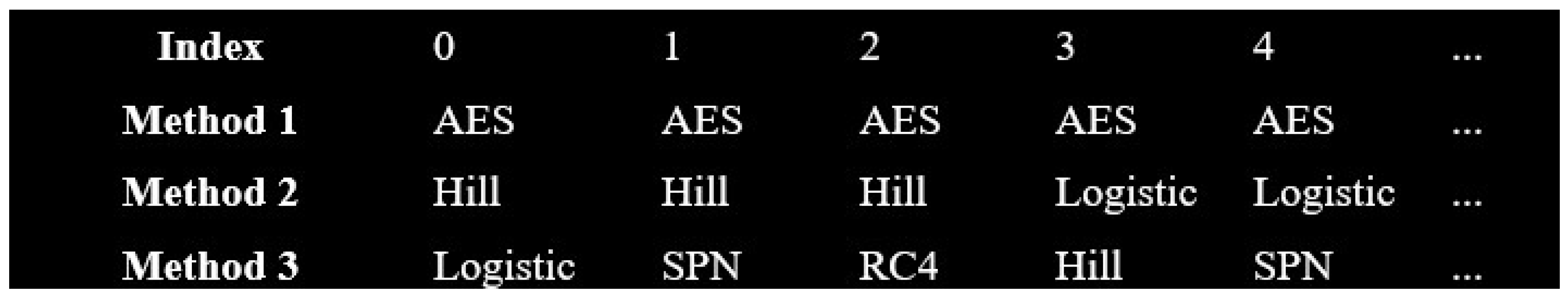 Figure 2, organizes these configurations within a compact, indexed framework to support efficient storage and quick access during encryption and decryption. This structured indexing not only facilitates lightweight implementation within constrained environments but also ensures that a diverse set of encryption techniques can be dynamically applied across different image regions, thereby enhancing the overall security and adaptability of the proposed encryption DCC.
