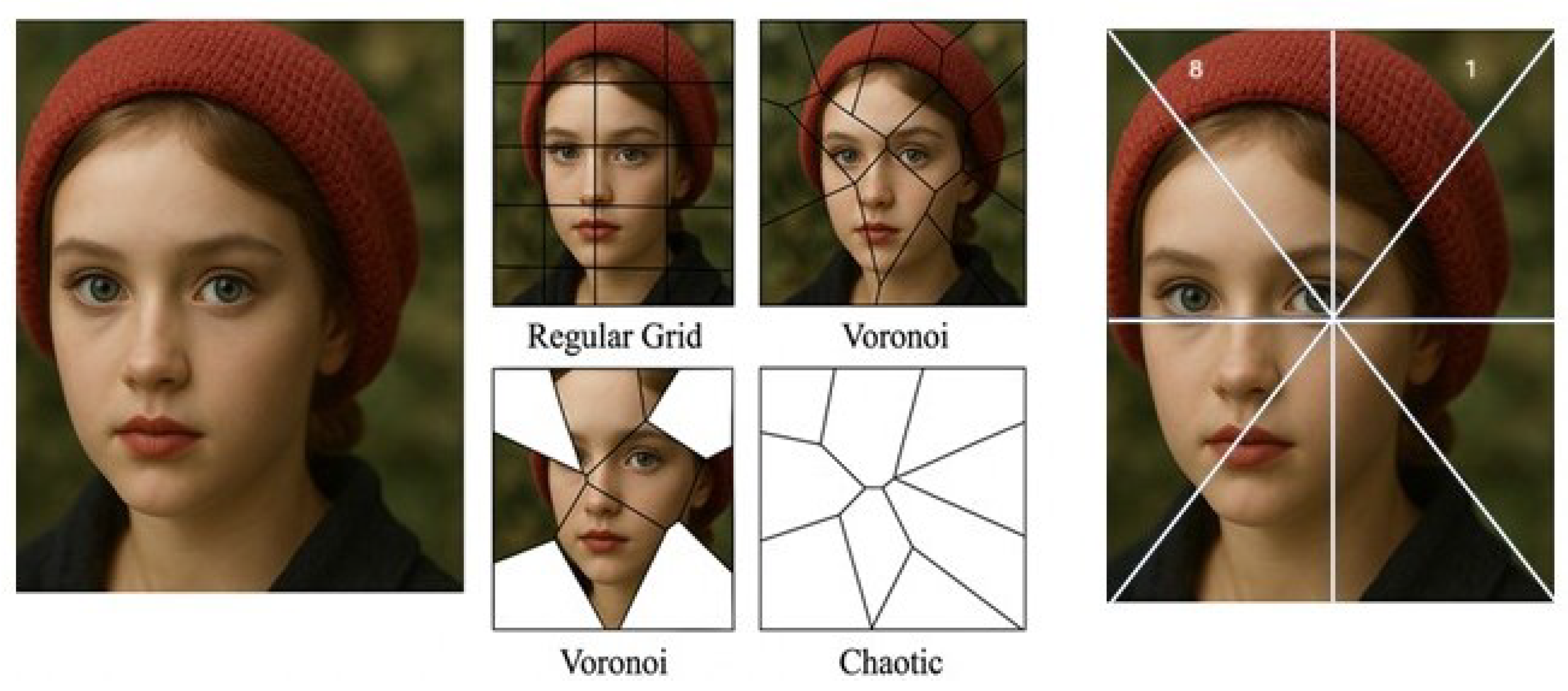 Figure 3. These strategies include both linear segmentation, which divides the image into uniform rectangular or grid-based sections, and non-linear segmentation, which utilizes more complex geometries, such as radial or angular partitions, to disrupt spatial correlations effectively. The selection of the segmentation approach significantly influences the encryption performance, as it determines how the image structure is decomposed to enhance inter-region entropy and resist structural attacks. By employing flexible segmentation methods, the proposed DCC ensures adaptability to diverse application requirements while maintaining high security through increased spatial confusion within the ciphertext.