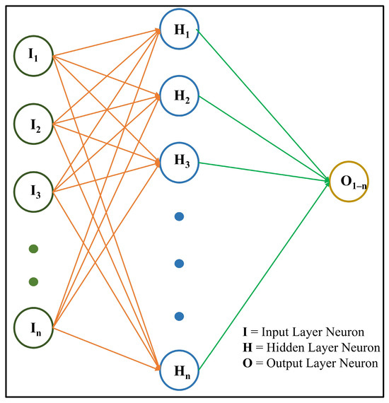 A feedforward backpropagation network’s architecture generally consists of an input layer for external data, one or more hidden layers for nonlinear transformations of the input, and an output layer for the final prediction [48]. Each layer comprises interconnected nodes or neurons, with links between nodes in adjacent layers possessing corresponding weights that dictate the strength of the connection. Neurons in each layer directly influence the neurons in the subsequent layer. Suppose that the output layer does not produce the desired result. In this case, backpropagation is triggered, transmitting an error signal along the original connection path, which is minimized by adjusting the weights of each neuron [38]. The hidden layers are crucial for identifying complex patterns and nonlinear relationships in the input, allowing the network to represent intricate functions.
