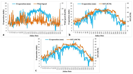 An algorithm in MATLAB (version: R2015a), known as FFBP, was developed for simulation purposes. A nonstop time series dataset covering the daily mean WS, SST (5 cm), SST (10 cm), and EVAP was gathered from January to December for the years 2002–2010. The data used were supplied by the Saudi Arabian Ministry of Environment, Water, and Agriculture (MEWA) and were specific to the Al Medina region (24°31′00.0″ N 39°35′00.0″ E). The patterns were examined in order to comprehend the internal organization of the data, as well as their trends (Figure 2). With respect to EVAP, the line graph (Figure 2a–c) illustrates a direct or indirect link between WS, SST (5 cm), and SST (10 cm).