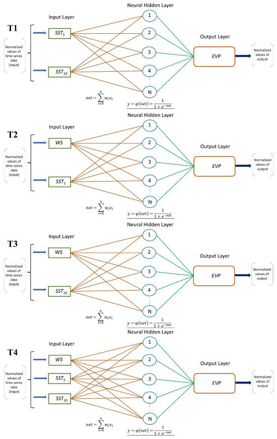 All networks (T1–T4) demonstrate their effectiveness in predicting EVAP. This study highlights the advantages of ANN modeling in EVAP prediction, especially in managing nonlinear relationships and the complex interactions among influencing factors like WS and SST.