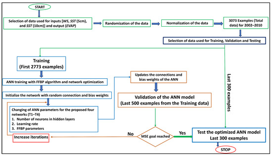 According to Hornik et al. [33], ANNs are semi-parametric regression estimators that are skilled at this task and can approximate almost any calculable function with arbitrary precision. An explicit technique for algorithmically transforming input into output is not necessary for the ANN methodology for system modeling. For the majority of networks, a collection of typical examples of the suggested mapping is adequate. When given input from a training sample, the ANN adjusts to produce the intended result [34,35,36]. Saudi Arabia’s desert environment, characterized by elevated temperatures, minimal precipitation, and intense solar radiation, results in significant EVAP rates, necessitating precise predictions for sustainable water management [37]. This study aims to forecast the complex relationship between WS, SST at 5 cm, SST at 10 cm, and EVAP using an ANN and the FFBP algorithm in Al Medina in Saudi Arabia. This issue is of considerable importance, as few research studies on EVAP prediction have been conducted in Saudi Arabia.