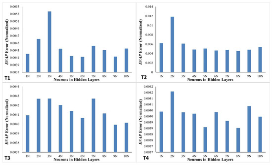 For an optimal network topology, enumeration techniques have been utilized, and the error values for EVAP, in comparison to the observed data, are depicted in Figure 5 for the validation dataset of the four networks (T1–T4). Figure 5 illustrates that T1 demonstrated the smallest error in EVAP with a single-layer network design of six neurons in the hidden layer. The smallest error for T2 and T4 was attained using a single-layer network structure with eight neurons in the hidden layer, but, for T3, this minimum error was achieved with eight neurons in the hidden layer. As of yet, no direct correlation has been identified to forecast the ideal quantity of neurons in the hidden layer; hence, reliance on enumeration techniques is necessary to achieve the optimal network structure.