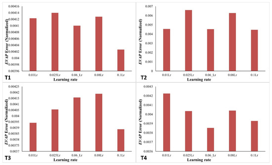 Variation in error in learning rate values in networks T1 (six hidden-layer neurons), T2 (eight hidden-layer neurons), T3 (nine hidden-layer neurons), and T4 (eight hidden-layer neurons) for the validation dataset.