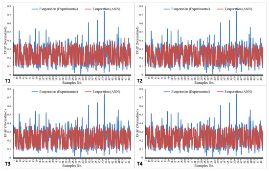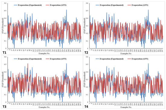 The results for the EVAP values, as predicted by the ANN, alongside the experimental values for the four networks (T1–T4), are illustrated in Figure 9. In Figure 9, the plots effectively demonstrate how the trend in the EVAP values closely aligns with the experimental results, with MSE values of 0.00343, 0.00394, 0.00309, and 0.00306 for T1, T2, T3, and T4, respectively.